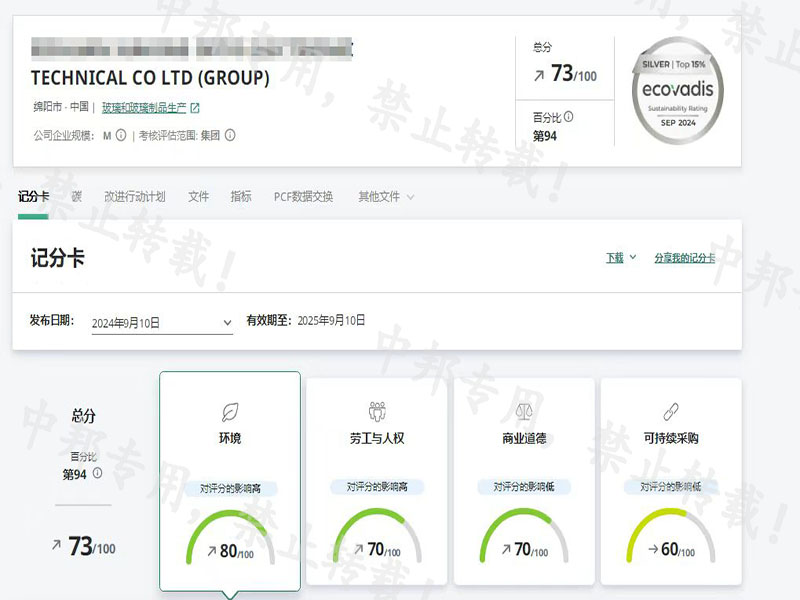 恭贺四川XX光电科技有限公司2024年9月顺利取得EcoVadis M型 73分银牌!!