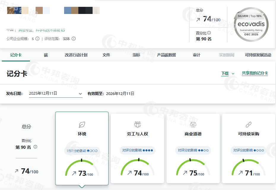 您当前的位置:首页 > 成功案例 > 恭贺上海XX翻译有限公司2025年12月EcoVadis取得74分的优秀成绩