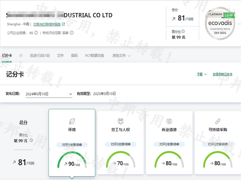 恭贺上海XX实业有限公司2024年10月顺利取得EcoVadis平台提交 铂金一枚!!