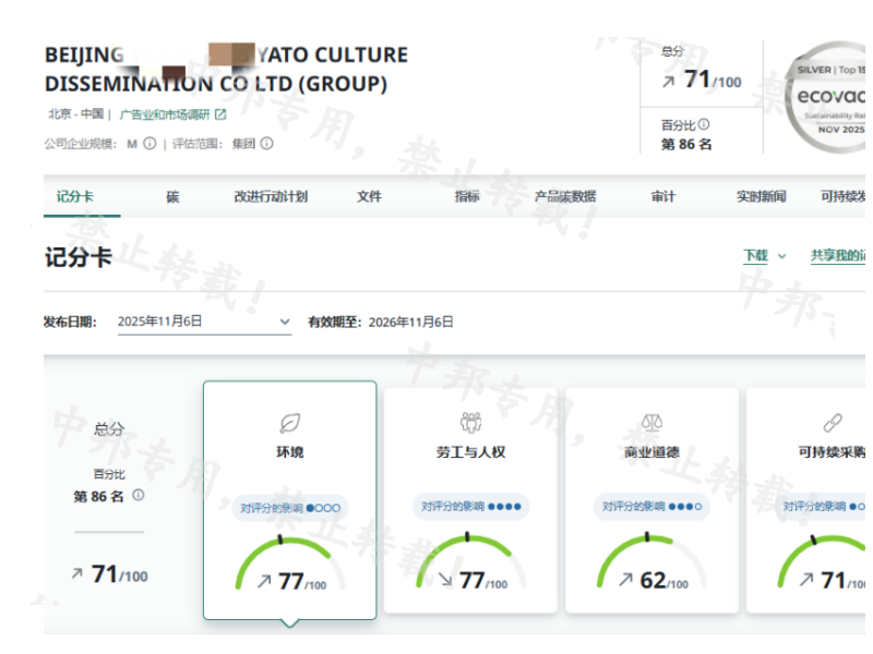 恭贺北京XX文化传播股份有限公司2025年11月EcoVadis取得71分的优秀成绩