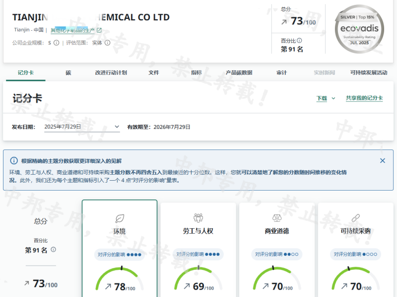 恭贺天津XX化工有限公司2025年7月EcoVadis取得73分的优秀成绩