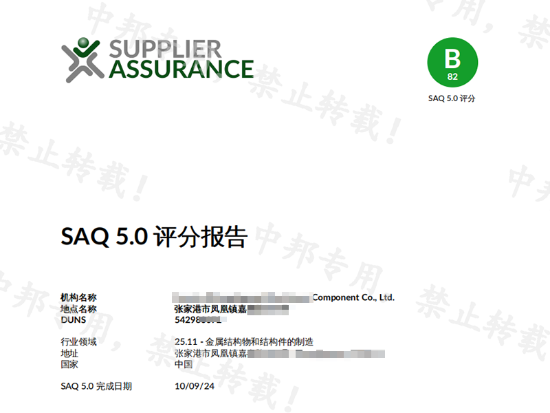恭贺张家港市XX机械部件有限公司2024年9月顺利取得SAQ问卷评估B级82分好成绩!!