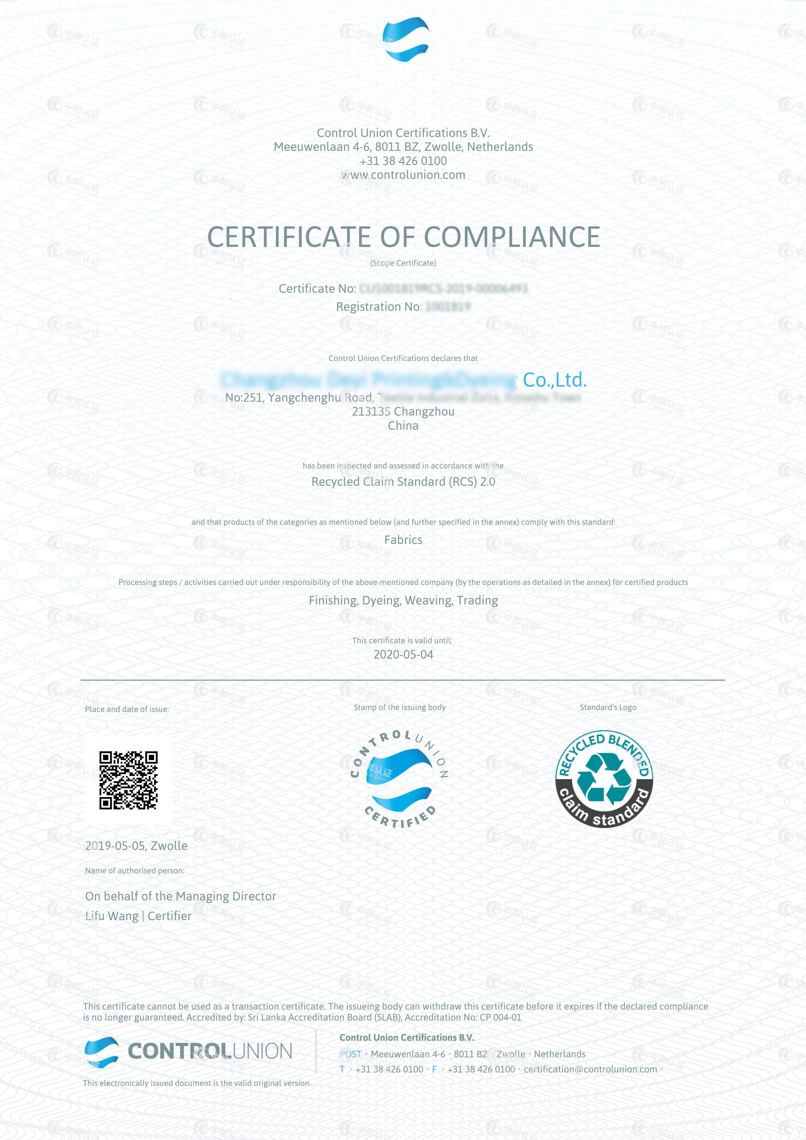 恭贺潍坊XX服装辅料有限公司2020年1月顺利通过RCS认证