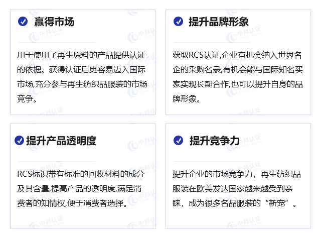 RCS回收声明标准,英文全称RecycledClaimed Standard,是TE纺织交易组织于2013年推出的另一回收(再生)方面的标准,用于使用了再生原料的产品提供认证的依据。 适用于再生原料含量在5%-100%之间的产品。认证机构有上海世优认证有限公司等几家机构,可自由选择,在TE-纺织交易组织网站可查到认证过的企业信息。 RCS认证的目的是确保产品含有回收材料。使消费者相信他们所买的产品中含有回收材料,因为他们选择了回收材料制成的产品,通过这个认证有助于增加使用再生材料,并减少废物量。RCS使用的标准为(CCS)的监管要求。就其本身而言, CCS是供应链的通用标准。此标准有助于认证过程的一致性和提高效率。一旦一个公司已被认证符合CCS的标准要求,其他的供应链要求都是在CCS基础上,减少重复认证。