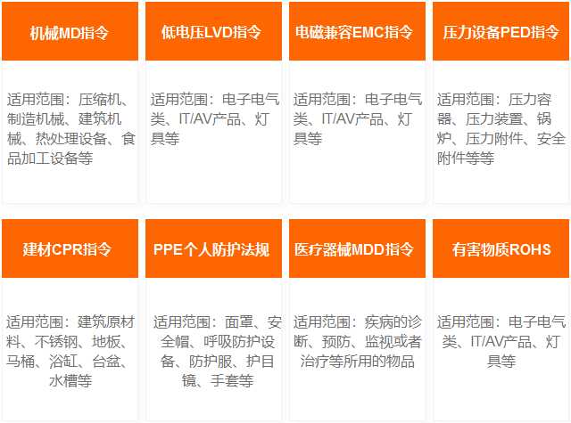 CE认证范围广泛,是产品出口欧盟的通行证,其常见指令包含但不限于以下内容。中邦可提供CE认证全面解决方案,全国认证热线:400-115-9001